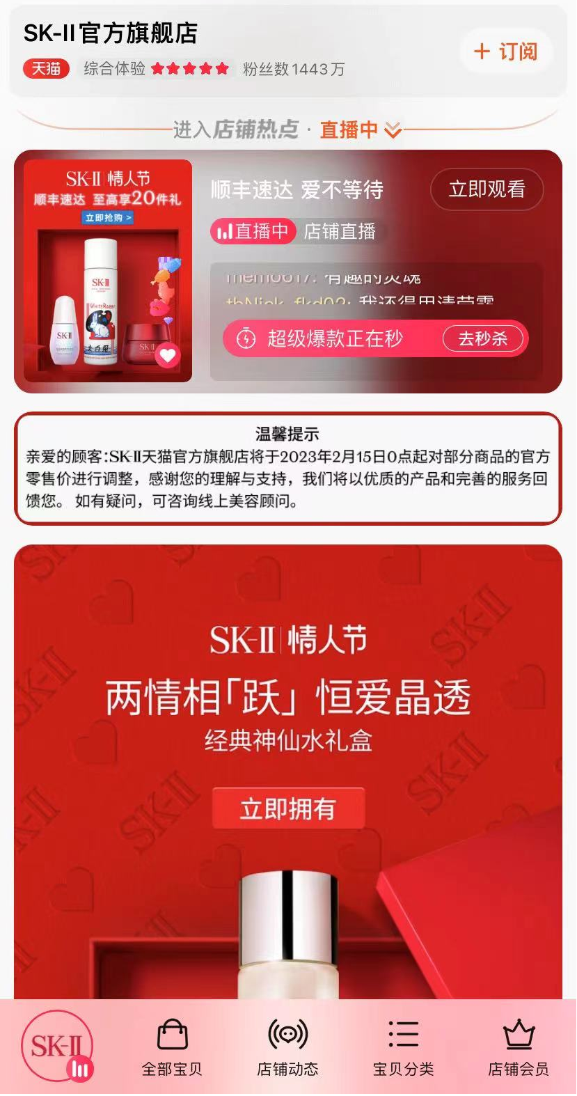 近日,宝洁旗下的王牌品牌SK-II在天猫官方旗舰店中发布涨价通知:自2023年2月15日0点起,对部分商品的官方零售价进行调整。