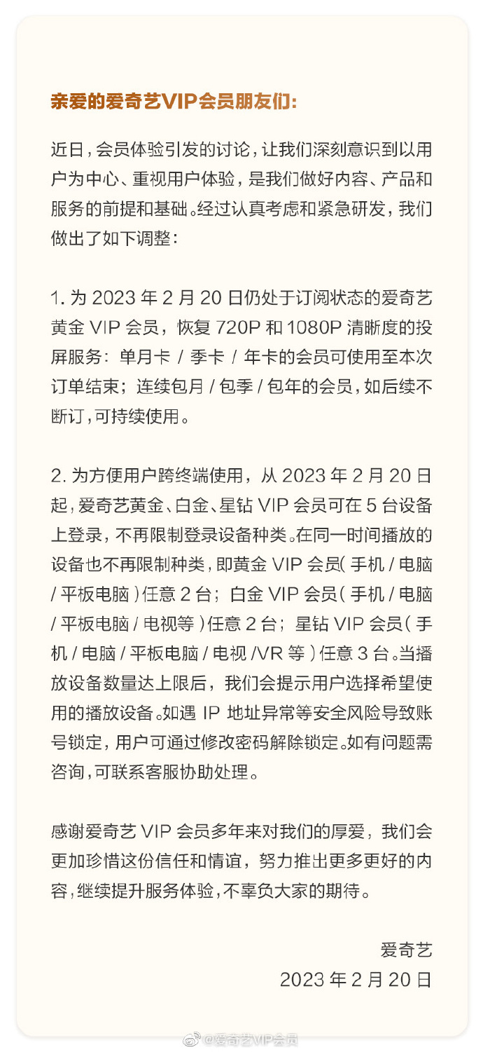 1.为2023年2月20日仍处于订阅状态的爱奇艺黄金VIP会员,恢复720P和1080P清晰度的投屏服务:单月卡/季卡/年卡的会员可使用至本次订单结束;连续包月/包季/包年的会员,如后续不断订,可持续使用。