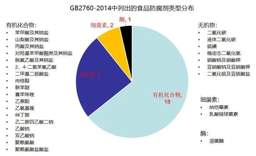 在GB2760-2014中,共收录28类防腐剂,其中有机化合物18类,无机物7类,细菌素2类,以及溶菌酶。需要注意的是,GB2760中还有大量的抗氧化剂、乳化剂、面粉处理剂等,实际上也能够起到一定防腐功能,只是考虑到它们的“主业”后,并未将其作为防腐剂。