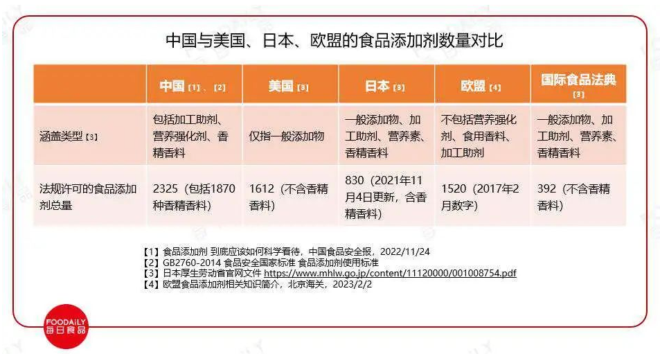 在对全球主要经济体法规体系下食品添加剂数量进行简单对比后我们发现:除去香精香料,中国的食品添加剂总量与日本和国际食品法典(CODEX)基本相当,而明显低于美国和欧盟。