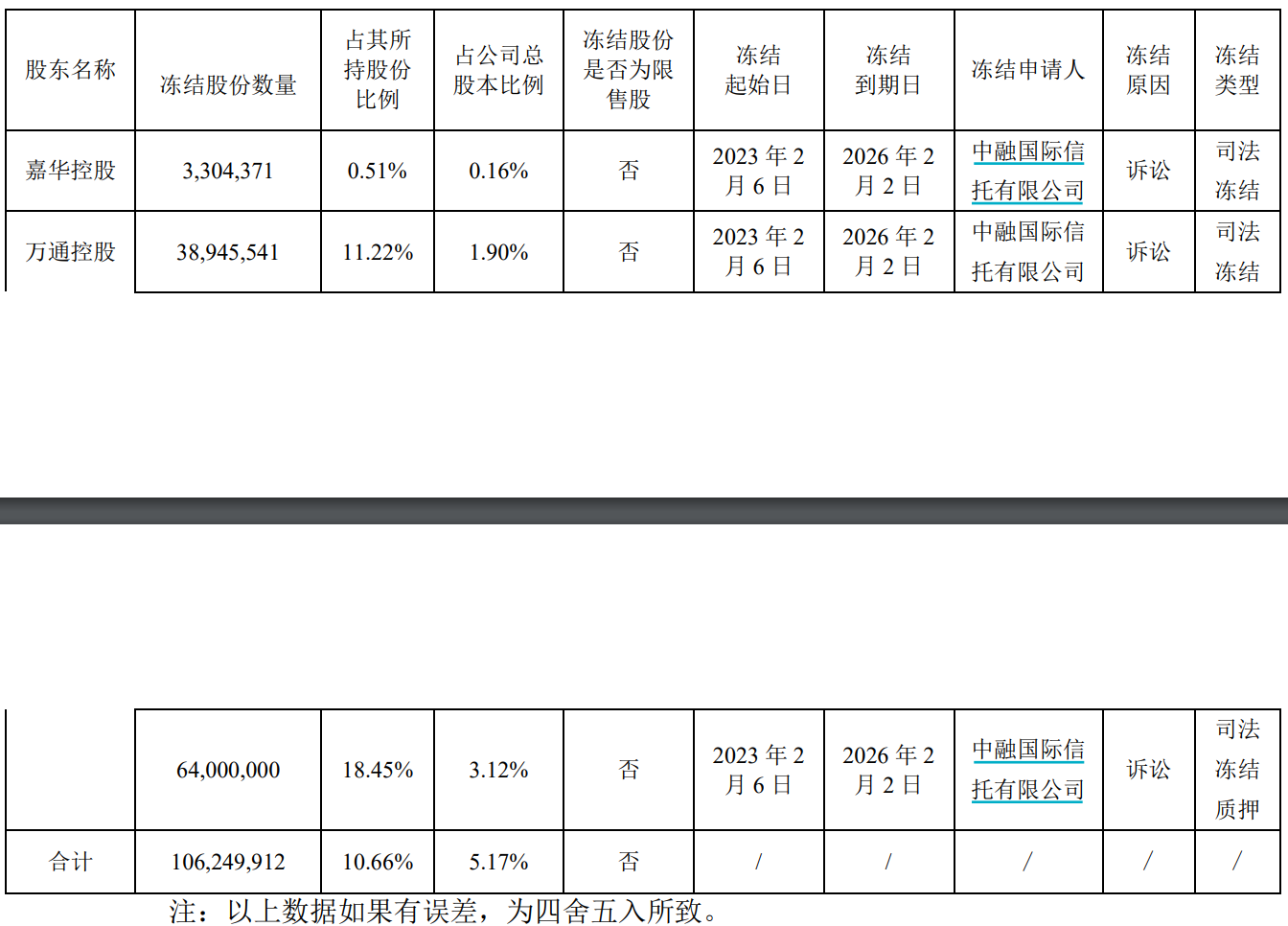 上述股份冻结起始日均为2023年2月6日,冻结到期日均为2026年2月2日,冻结申请人为中融信托,冻结原因为诉讼。