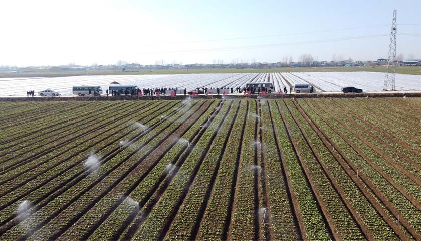 该基地引进了智能节水浇灌系统技术,水流从几条主管道通往农田,为作物输送“养分”,打破了原来靠天吃饭的局面。蔬菜产量提高了,收入自然也高了。