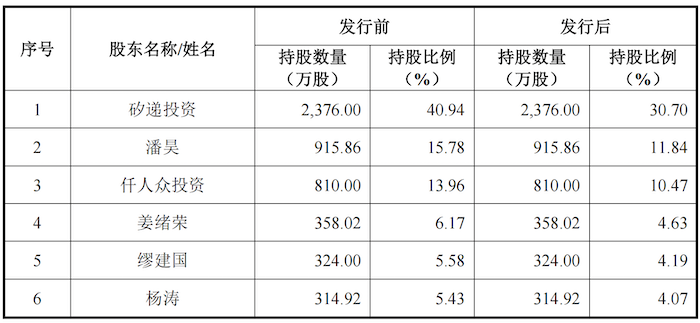 截至发行前,矽递科技共12名股东,有7名股东系自然人,其中实际控制人潘昊直接及间接合计控制公司3291.86万股股份,占公司表决权的56.72%。非自然人股东5名,矽递投资为实际控制人潘昊个人持股平台,仟人众投资为公司的员工持股平台,此外还包括智禹博诚、由和元坤和极目视觉三家私募投资基金。