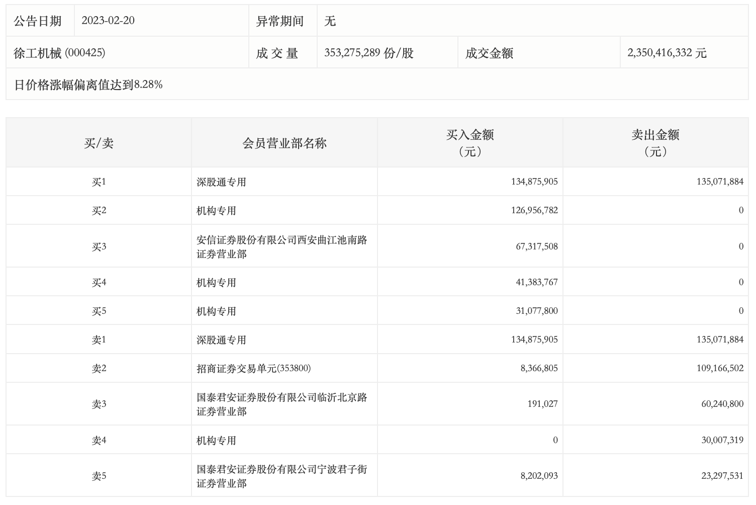 2月20日,徐工机械今日涨停,成交额23.50亿元,换手率7.30%。盘后龙虎榜数据显示,深股通专用席位买入1.35亿元并卖出1.35亿元,3家机构专用席位净买入1.99亿元,1家机构专用席位净卖出3000.73万元。