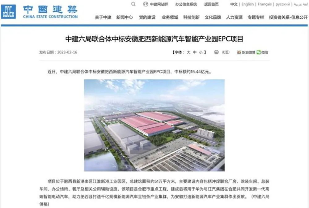 近日,中建六局官方宣布以15.44亿元中标了安徽肥西新能源汽车智能产业园EPC项目,而这一项目正是华为和江淮汽车合作的新能源汽车工厂。