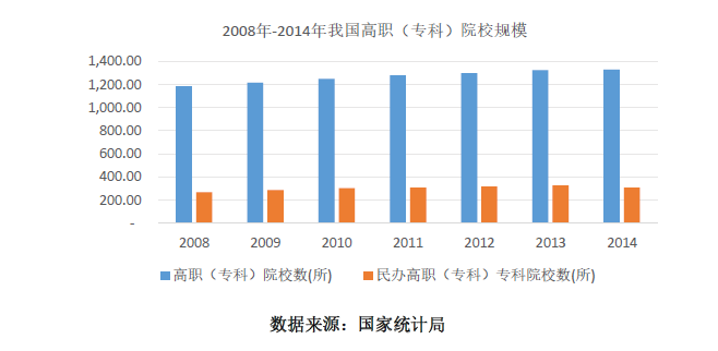 在高等职业教育教育方面,据国务院教育督导委员会2015年9月发布的《全国职业教育工作专项督导报告》,高职院校在校生已达1006.6万人,高职教育占整个高等教育规模的40%。另据《现代职业教育体系建设规划(2014-2020)》,2015年我国高职在校生人数将达1390万人,2020年达到1480万人。其中民办高职(专科)院校从2008年的269所增至2014的307所,增幅14.13%,高于公办院校的增幅。如下图所示: