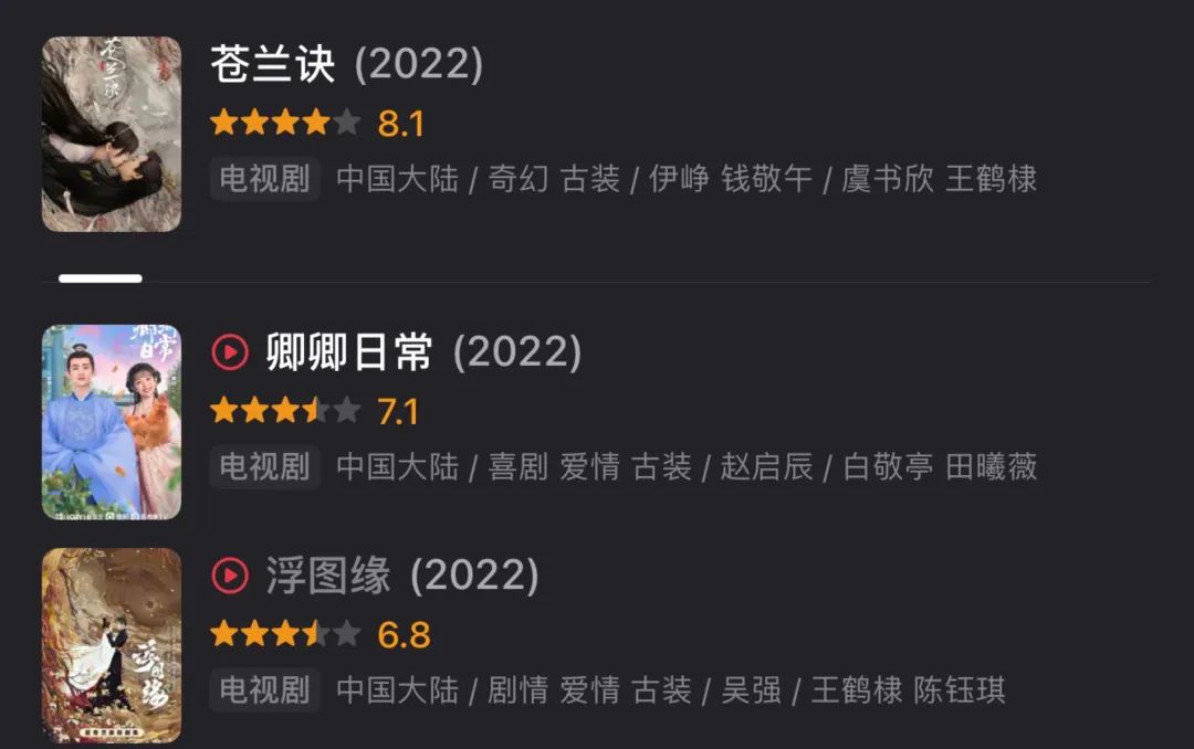 难能可贵的是,截止发稿前,《苍兰诀》的豆瓣评分已上升至8.1,《卿卿日常》《浮图缘》分别稳定在7.1和6.8。