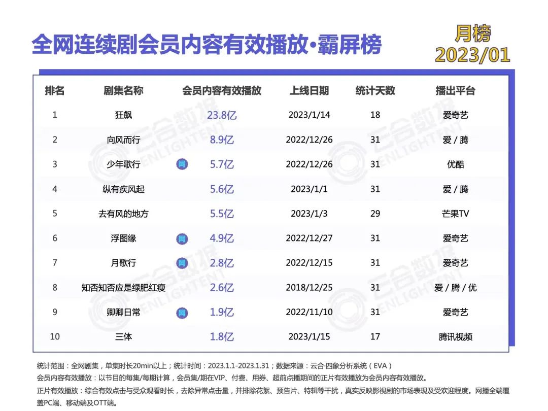 与之呼应,在云合《1月全网连续剧会员内容有效播放霸屏榜》上,爱奇艺《狂飙》以逼近24亿的会员有效播放断层领先,腾讯视频押宝的《三体》仅排在榜单末尾。而优酷《少年歌行》虽拿下了榜单TOP3,但有效播放与《狂飙》差距显著。