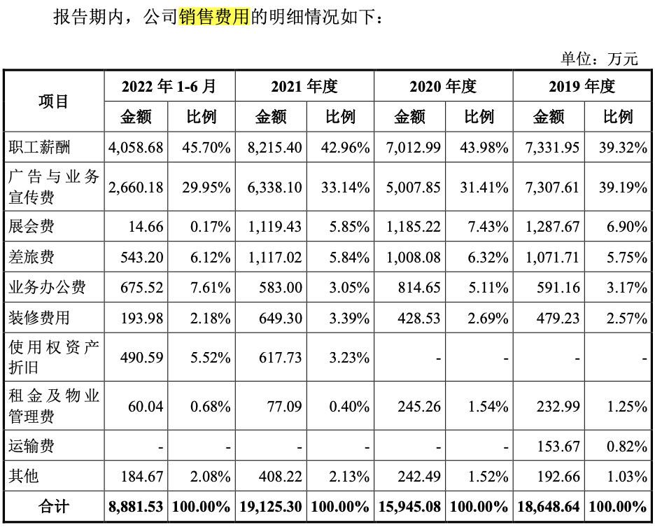 另一个关注点便是远超智慧销售费用高企。报告期内(2019年-2021年以及2022年上半年)用于广告业务投放的费用合计达到2.13亿元,而在消费转型之下,相对薄弱的研发费用是否会对公司在竞争激烈的家居市场产生不利影响?