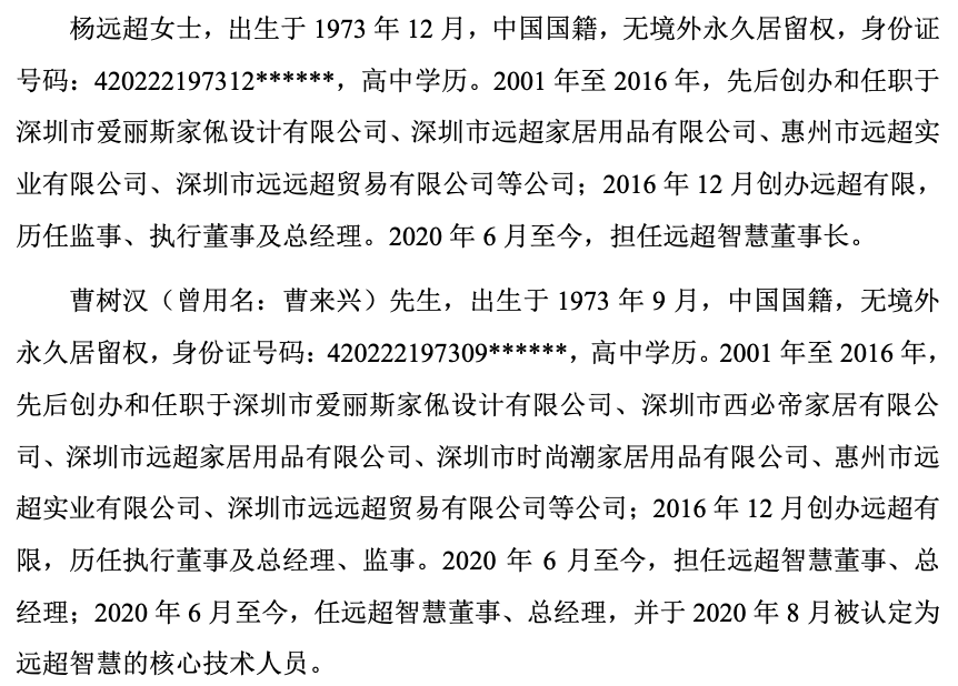 两名创始人自2000年开始从事家具业务,并先后创办了多家公司,由不同公司分别承担家具产品的生产、销售业务,而CBD家居品牌的创立主体为深圳市爱丽斯家俬设计有限公司,历史上的使用主体包括:深圳市爱丽斯家俬设计有限公司、深圳市西必帝家居有限公司、深圳市远超家居用品有限公司、深圳市时尚潮家居用品有限公司及深圳市远远超贸易有限公司,(前述公司均注销)最终,选择了以远超智慧作为上市主体。