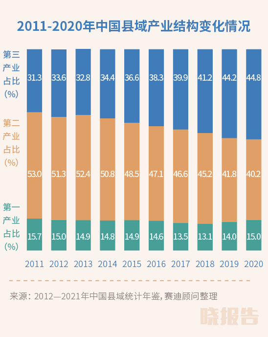 中国县域统计年鉴数据显示,从2011年到2020年,第三产业对中国县域经济的贡献占比,累计提升了13.7个百分点,占比接近过半。