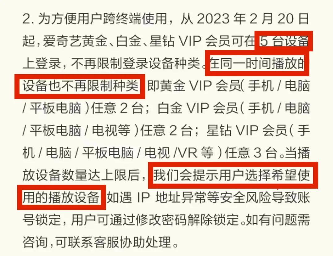 声明提到,今起所有会员均可在“5台设备”登陆,不再限制登陆设备种类。而“同一时间播放的设备不再限制种类”,代表着当下会员能至少选择任意2台设备登陆了。“我们会提示用户选择希望使用的播放设备”则解决了用户突然被强制下线的困扰,给予用户更自主的选择权。