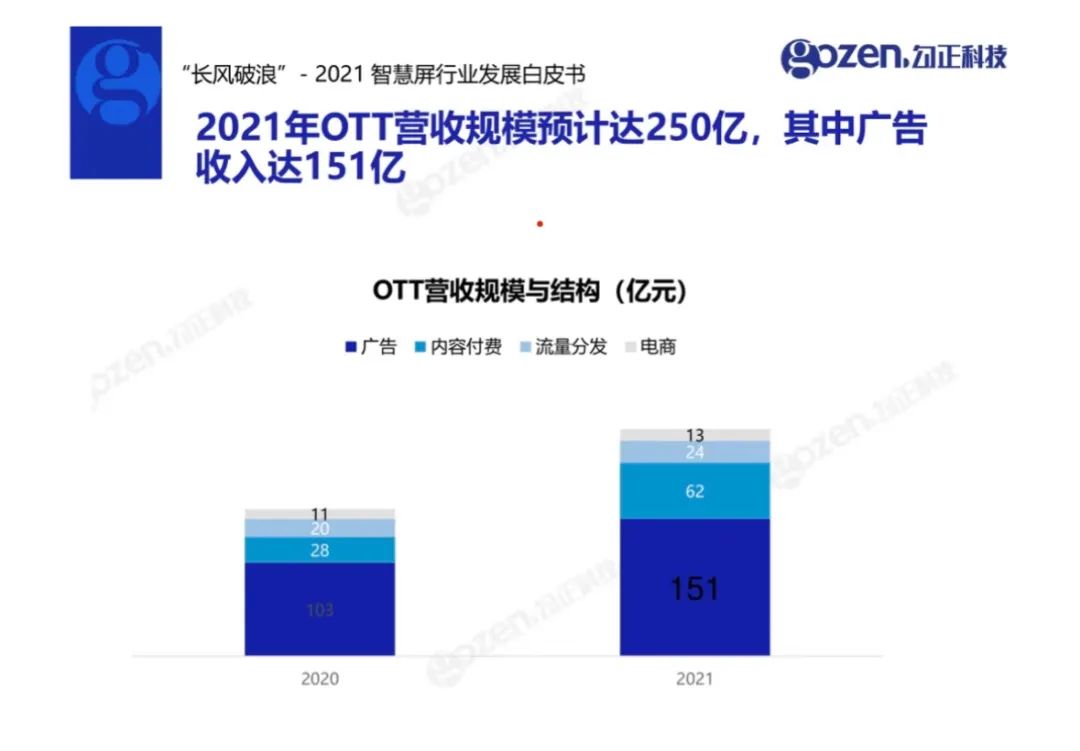 而事实上,电视会员费其实从来就不是OTT行业赚钱的大头,广告收入才是。《2021智慧屏行业发展白皮书》就曾提到,2021年OTT营收规模将到达250亿,而这其中,广告收入占据了151亿的最大头。