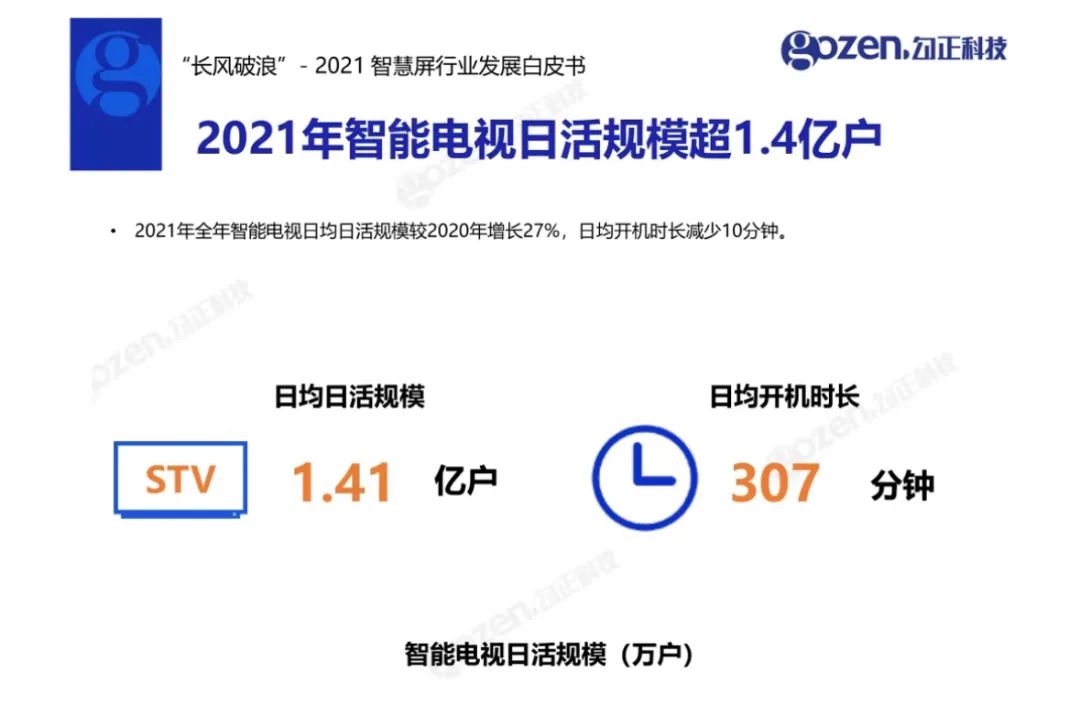 一个很容易观察的现象是,目前OTT已成为很多家庭选择客厅娱乐的主力,尤其每逢春节期间,大批年轻人都是在电视上陪爸妈一起看的《狂飙》《人世间》等爆剧。反应到用户数据上,勾正科技发布的《2021智慧屏行业发展白皮书》曾提到,“2021年智能电视日活规模就超过了1.4亿户,日均开机时长到达了307分钟。”