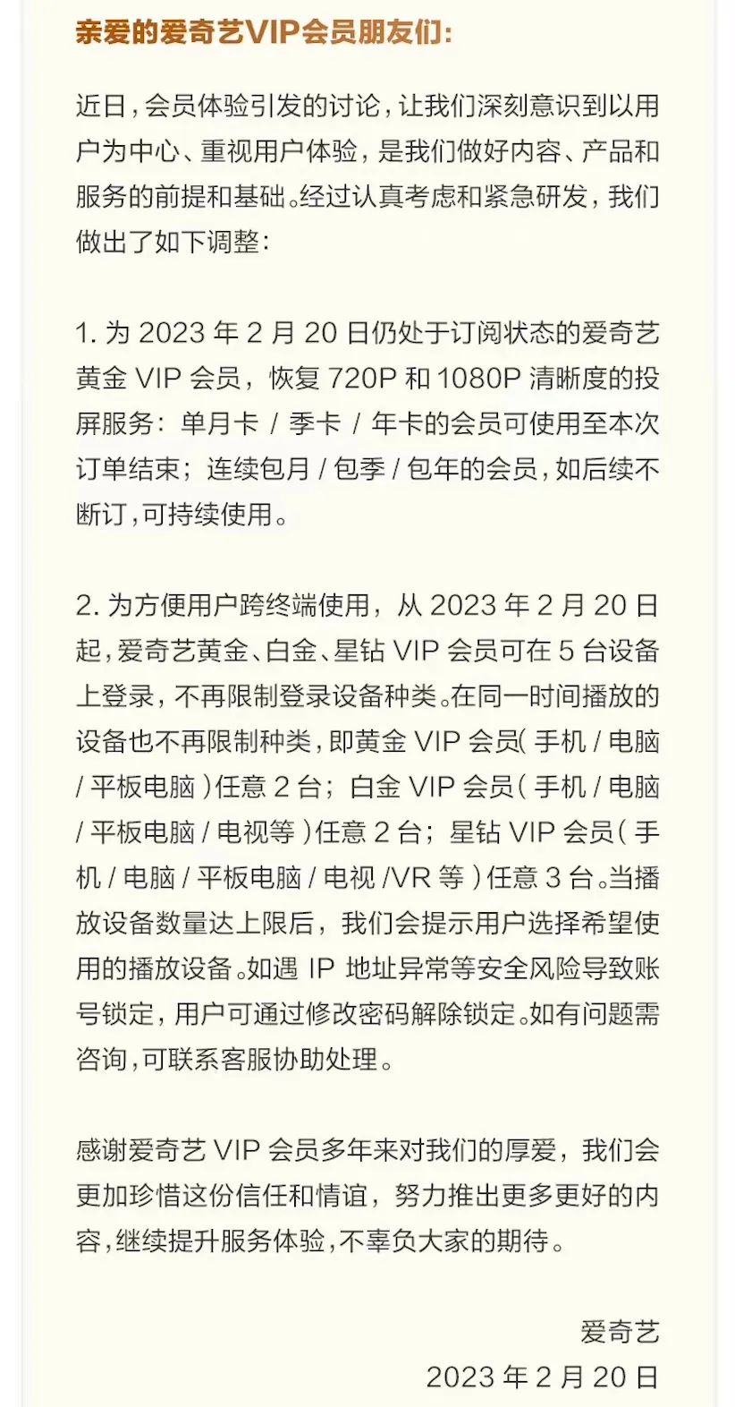经历了480P投屏限制争议、遭老会员起诉等风波后,爱奇艺近日发博回应,为老黄金VIP会员恢复720P和1080P高清投屏服务,并且不再限制登录设备种类,所有会员可同时登陆任意2台或3台设备。