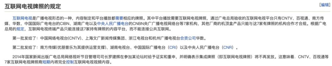 想当年,在智能电视发展的垦荒期,广电总局曾在09-14年下放过两批互联网电视牌照给7家机构(分别为CNTV、百视通、南方新媒体、华数、湖南广电、中国国际广电电台的CIBN、中央人民广播电台的CNBN),且后续就暂停了发放。
