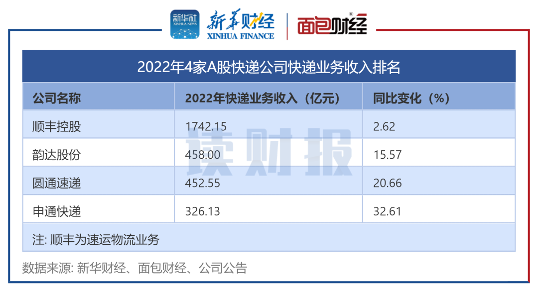 从收入来看,顺丰控股2022年全年快递业务收入达1742.15亿元,位列第一。韵达股份的2022年快递业务收入为458亿元;圆通速递紧随其后,快递业务收入为452.55亿元;申通快递2022年快递业务收入较低,为326.13亿元。