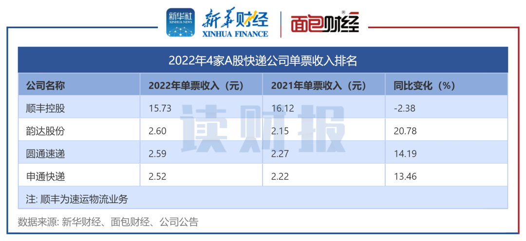 数据显示,顺丰控股2022年单票收入为15.73元/件,韵达股份、圆通速递及申通快递的单票收入相近,均在2.50元/件至2.60元/件之间。