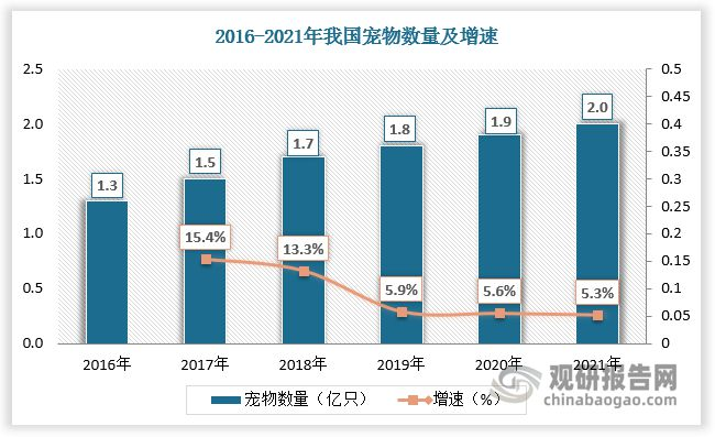 《2021年宠物行业白皮书》显示,截至2021年年末,在所有宠物中,我国养猫和狗的人群数量占比均超过半数,且猫猫教人数已超过狗狗教。根据观研报告网相关数据显示,2018-2021年,养猫人数和养犬人数分别由2258万人提升至3225万人,由3390万人提升至3619万人;宠物总数量由2016年的1.3亿只增至2021年的2亿只,这为宠物保健品在中国市场的发展奠定了坚实的基础。