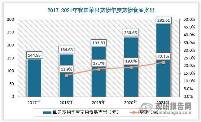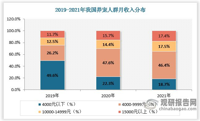 2. 高收入宠物主占比提高,穷养自己富养宠根据观研报告网相关报告显示,随着居民收入不断提升,月收入在10000以上的宠主占比由2019年的24.2%提升至2021年的34.9%,单只宠物年度宠物食品支出也由2017年的144.55元增长至2021年的281.61元。