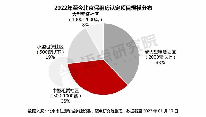 从认定的项目规模来看,目前获得认定书的保障性租赁住房项目的产品以2000套(间)以上规模的超大型租赁社区和500-1000套(间)的中型租赁社区为主;其次是500套(间)以下的小型租赁社区和1000-2000套(间)的大型租赁社区各自占比19%和8%。