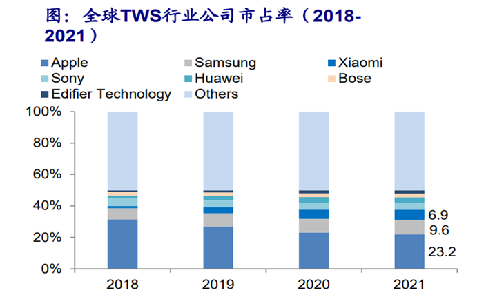 不过该领域的大部分蛋糕被苹果、三星、索尼、小米这样的消费电子寡头分走,数据显示2021年全球前7大TWS品牌商合计市占率近半数。