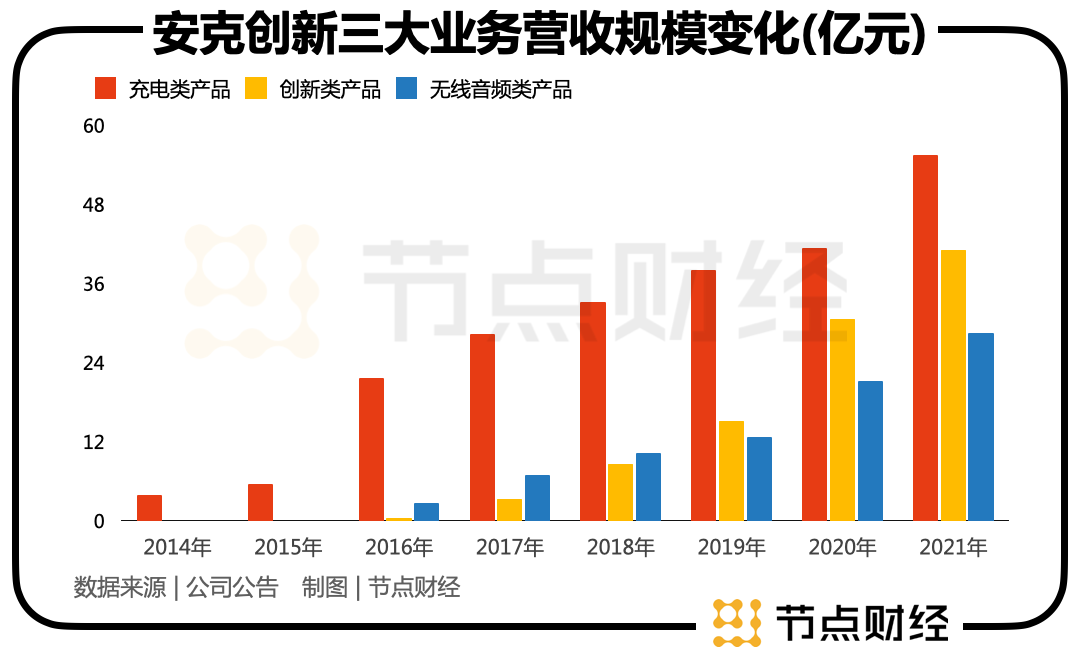 财报数据显示,公司充电类产品收入从2014年的3.93亿元一路攀升至2021年的55.52亿元,年复合增速高达46%。除此之外,公司还在2016年推出“创新类产品”及“无线音频类产品”两大新业务。