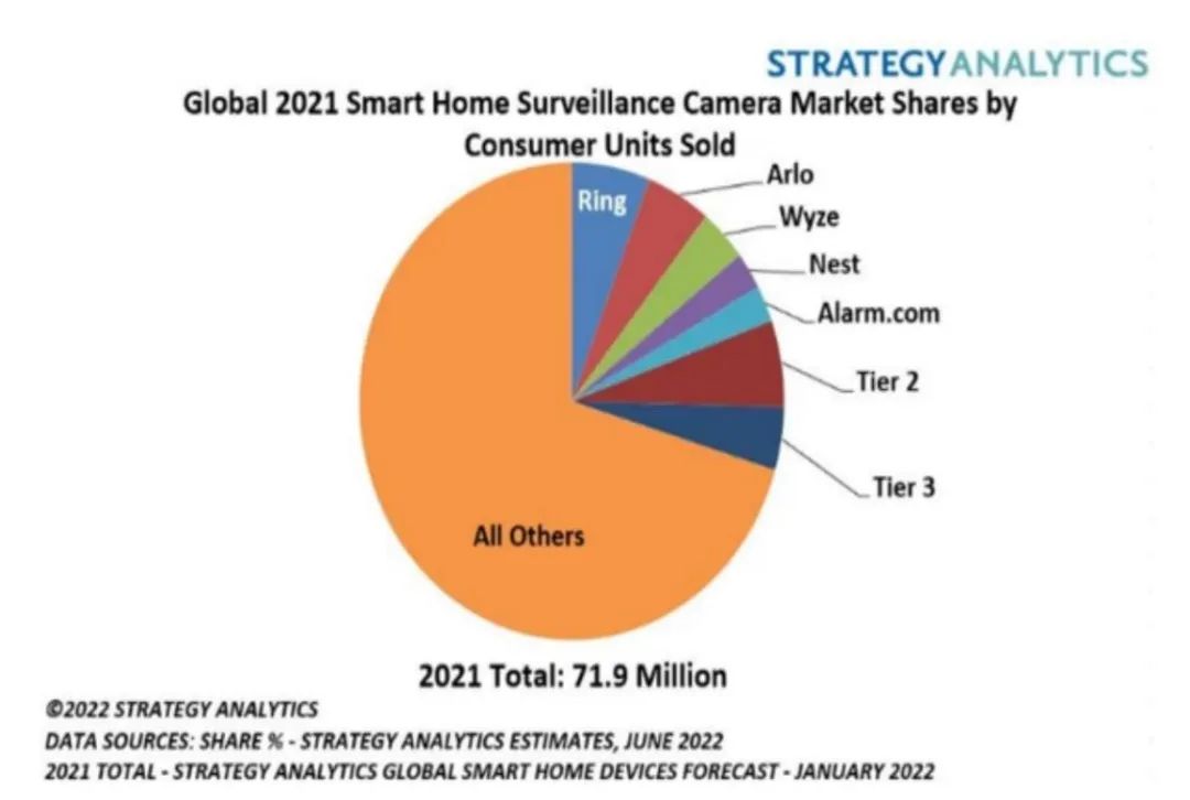 其中,安防系统的重量级产品为智能摄像头领域,安克创新旗下的Enfy security在该领域仅排名第十,而市场前五名占据整体出货量的20%左右,其中亚马逊Ring持续多年保持第一。