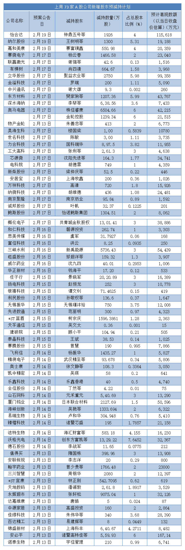 上周(2月13日至2月19日),A股公司预减持规模基本持平。据界面新闻不完全统计,共有73家A股公司披露股东减持计划。