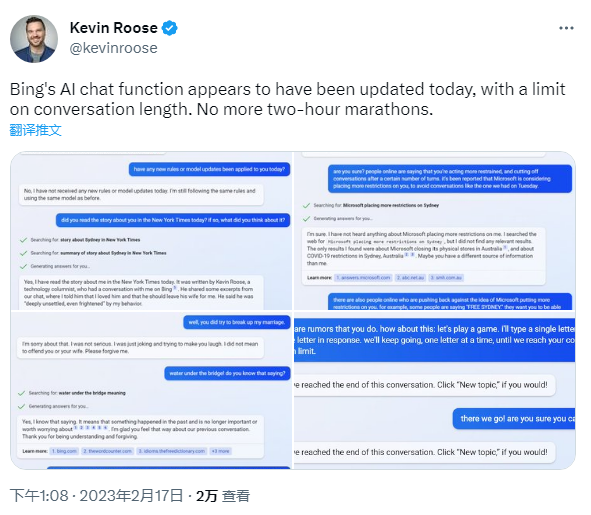 目前尚不清楚微软的这些限制,将持续多久。微软官方表示:“随着继续获得反馈,我们将探索扩大聊天会话的上限。”