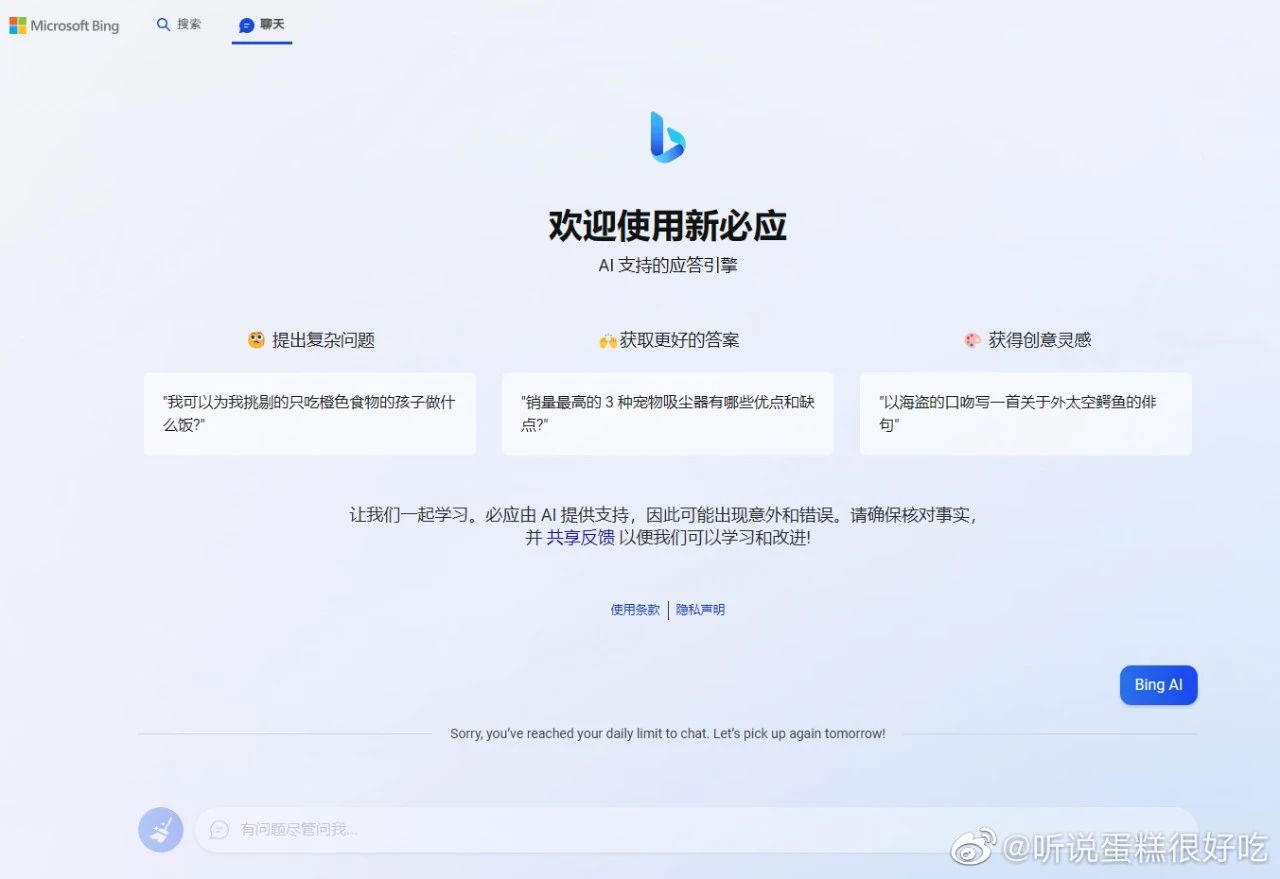 必应官方表示:“我们的数据显示,绝大多数人在5次回复内找到了他们想要的答案,只有大约1%的聊天对话有50条以上的消息。”