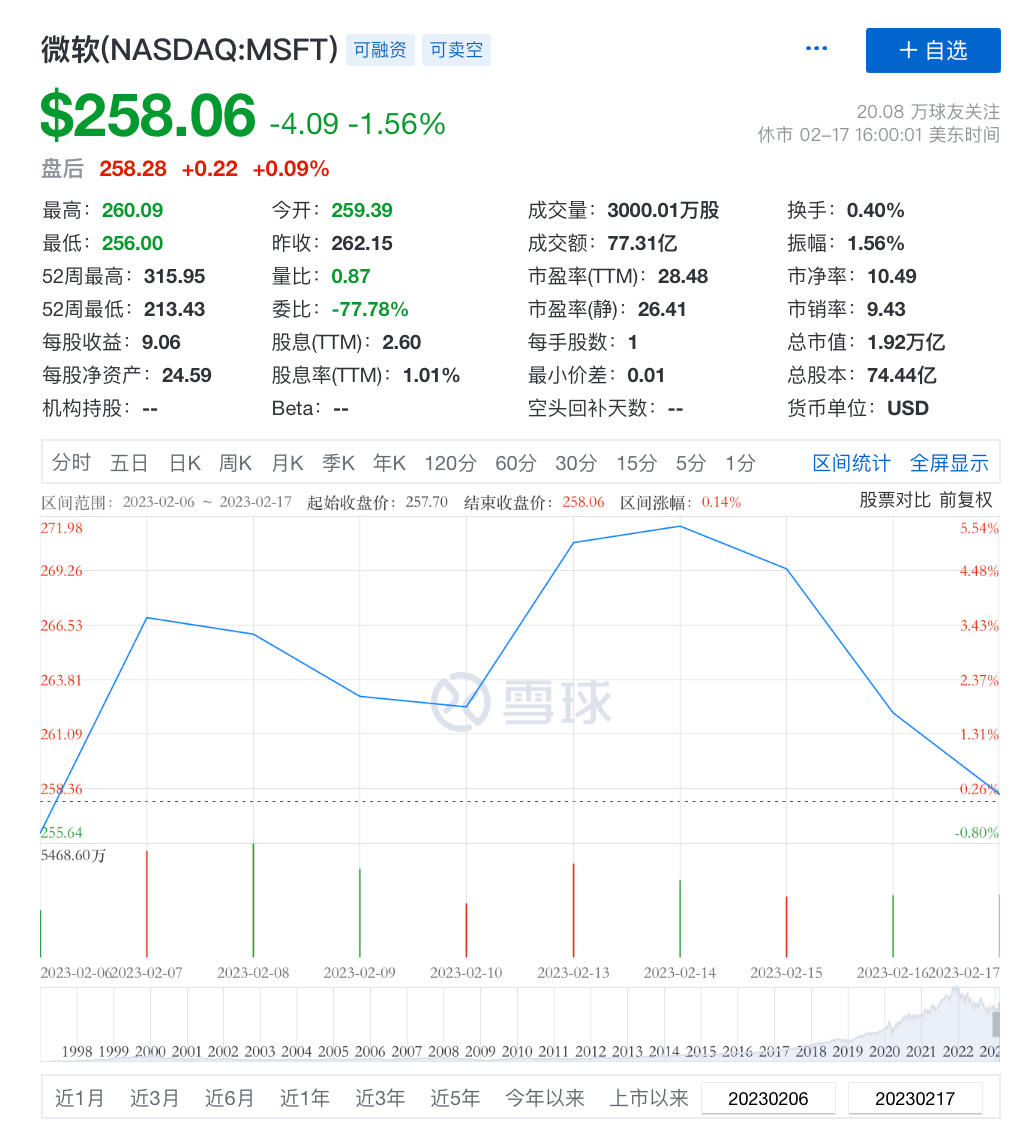 2月17日,微软股价跌1.56%,报258.06美元,总市值1.92万亿美元。