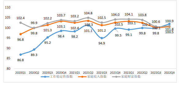 两家机构发布的《2022年中国家庭财富变动趋势—中国家庭财富指数调研年度报告》指出,受到新一轮疫情、俄乌冲突、美国加息等因素影响,2022年前三季度,中国家庭财富和收入增速有所下降,且收入稳定性下降。第四季度,由于疫情防控政策优化,加上年终奖因素,家庭财富和收入增速有所上升,工作稳定性也出现回升。