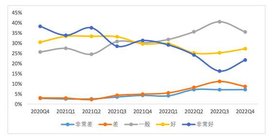 报告称,相比三季度,预期未来一年经济发展“差”的家庭占比由2022年三季度的11.1%下降至8.6%,预期未来一年经济发展“好”的家庭占比由2022年三季度的25.2%上升至27.2%,预期未来一年经济发展“非常好”的家庭占比由2022年三季度的16.2%上升至21.6%。