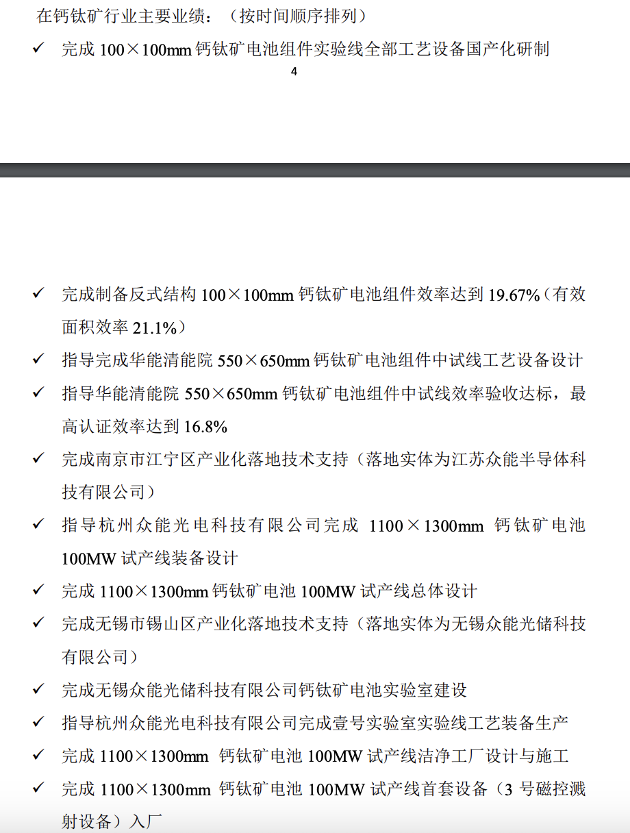 奥联电子此前发布的公告显示,胥明军曾指导完成华能清能院550×650mm钙钛矿电池组件中试线工艺设备设计;并指导华能清能院 550×650mm钙钛矿电池组件中试线效率验收达标,最高认证效率达16.8%。
