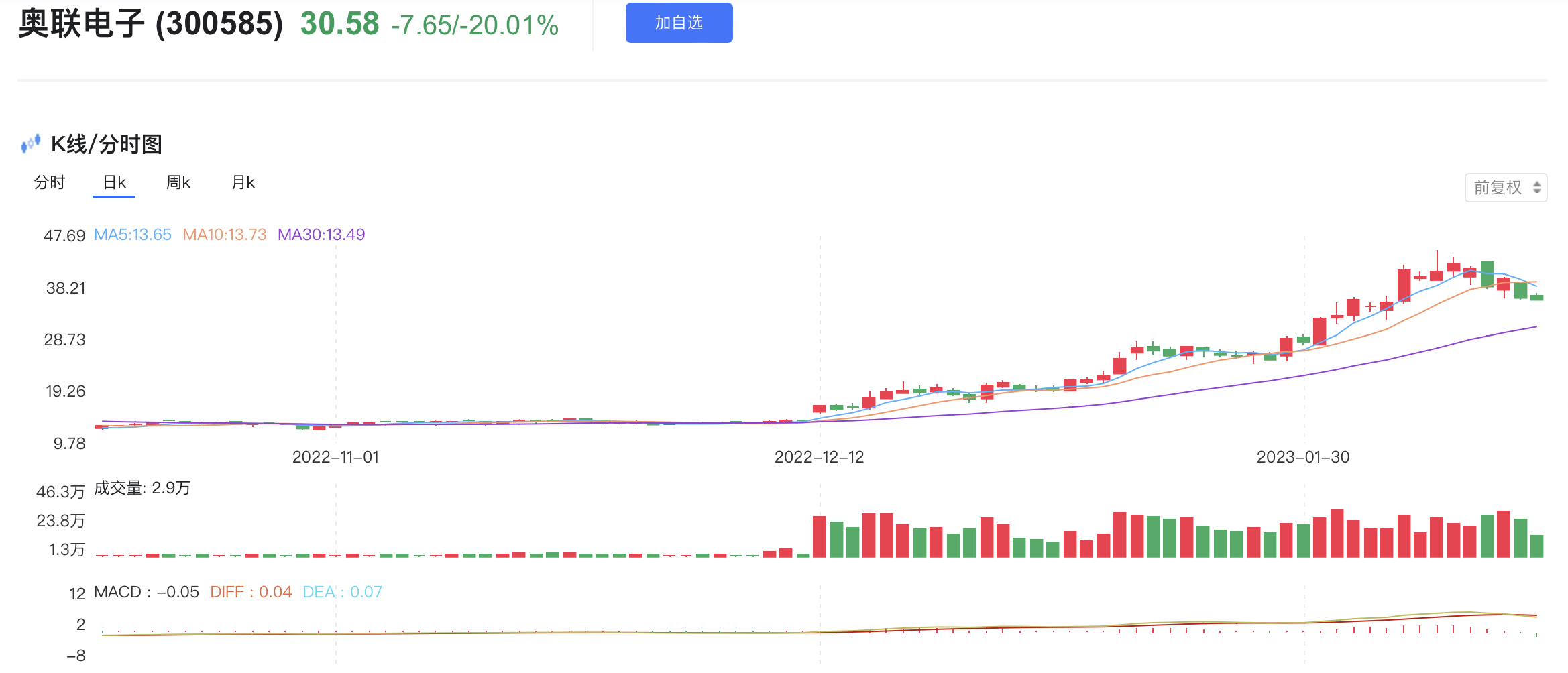 2月21日,奥联电子股价大幅异动,截至收盘下跌20.01%,收于30.58元/股,总市值约52亿元。