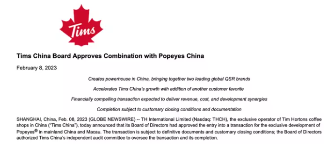 2月9日,Tims中国发布了有关其董事会批准和美国炸鸡品牌Popeyes中国合并的公告。自此,Popeyes这一炸鸡连锁在华“操盘手”一职,正式交到了Tims中国手里,而这也让Tims形成了咖啡+炸鸡的资产布局。