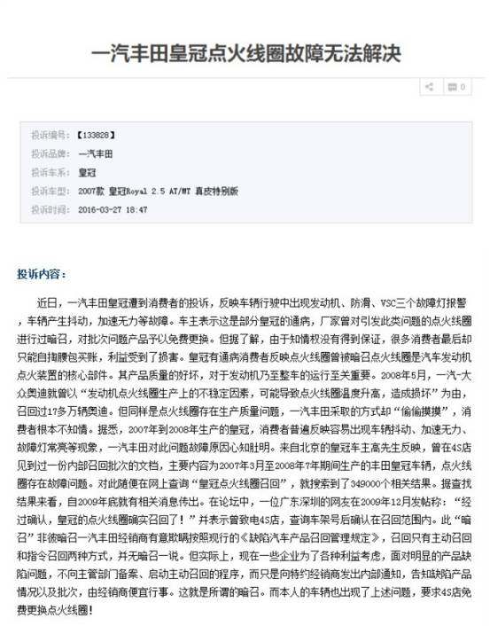 这位车主在车质网投诉称,一汽丰田皇冠曾对点火线圈故障进行暗召,该车主从其他车主那里得到了对此事的确认,对一汽丰田的所作所为感到十分不满!另外,车主认为点火线圈是发动机的重要部件,影响发动机和整车的运行,自己的车辆也有上诉问题,强烈要求4S店免费更换点火线圈。