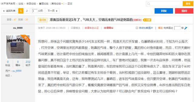 在太平洋汽车网论坛上,有一位皇冠车主无奈地表示,每次打开空调都会有一股刺鼻的气味,并且打开天窗异味更加严重。去4S店保养被告知皇冠车内有异味是通病,现在买车这么久还没散味,该车主感到不知所措,希望遇到同样问题的车友能一起联合向厂家反映。