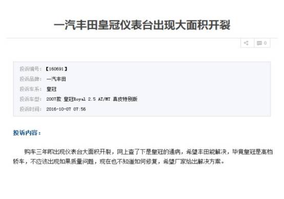 这位车主投诉称,自己的车才买了三年就出现了仪表台大面积开裂的问题,后来在网上查询得知是皇冠的通病,希望厂家能够帮忙解决这个问题。另外,该车主还上传了图片作为证据: