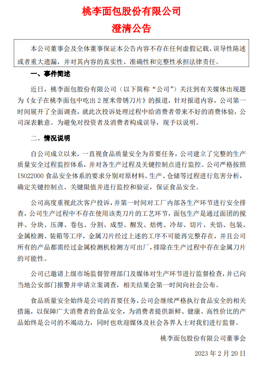 2月20日,桃李面包发布澄清公告,称其第一时间对工厂内部各生产环节进行安全排查,公司生产过程中不存在使用该类刀片的工艺环节,并且公司所有的产品都需经过金属检测机检测方可出厂,排除在生产过程中存在金属刀片的可能性。此外,公司已邀请上级市场监督管理部门及媒体对生产环节进行监督检查,并已向当地公安部门报警并申请立案调查,相关结果会第一时间向社会公布。”