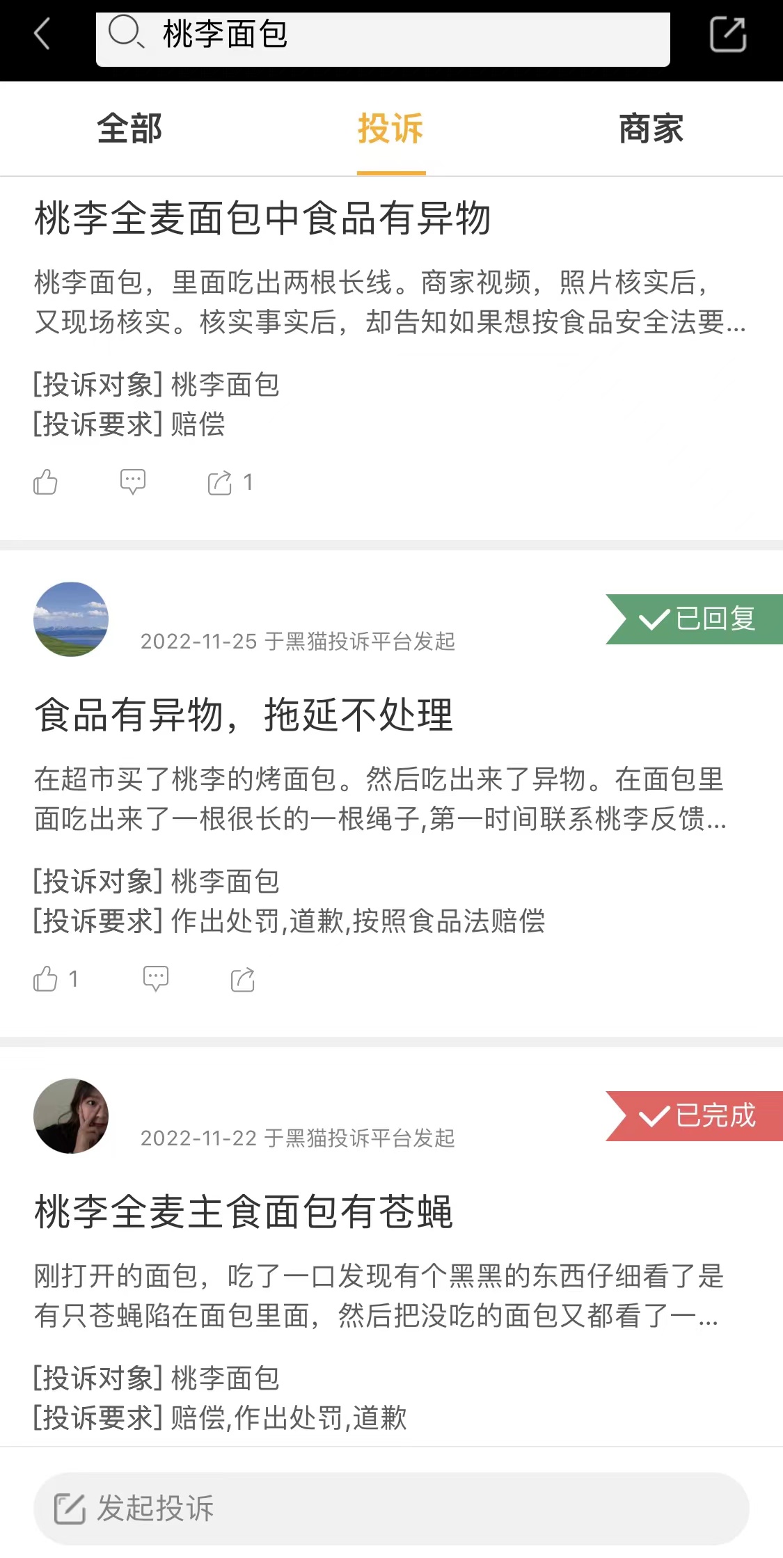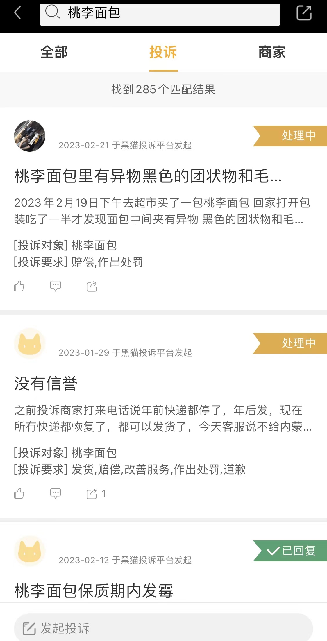 事实上,这已不是桃李面包首次被爆出食品安全问题,2022年9月下旬就曾有媒体报道有消费者在食用桃李面包时发现里面有成堆在爬的蛆虫;此外,翻阅黑猫投诉可以看到285条关于桃李面包的投诉,其中不乏面包在保质期内发霉、在面包里吃出黑色团状物、苍蝇、头发等多种问题。