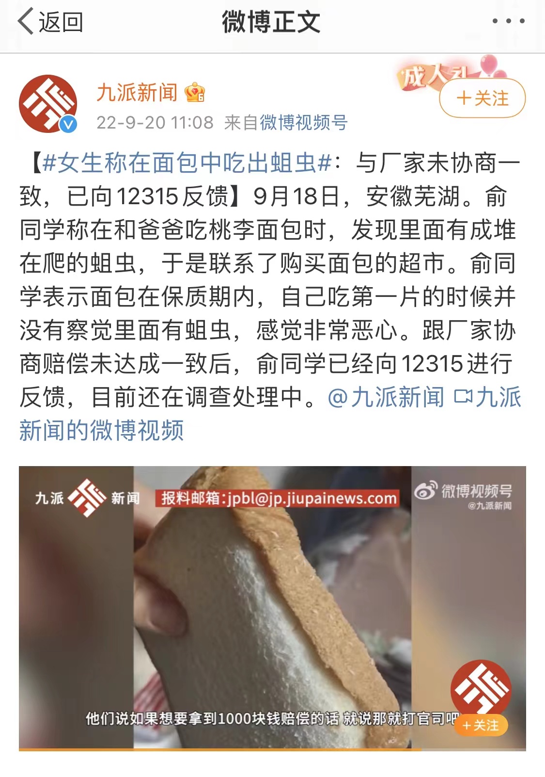 值得一提的是,同日晚间,上述消费者在其抖音账号再发视频称,其在2月19日曾和桃李面包另一负责人有过接触,对方当时同意给其1000元赔偿、公开致歉、并出资5000元以该名消费者的名义捐助给当地一家儿童福利机构。然而2月20日早间桃李面包方面“变卦”,目前双方都在等待相关部门的调查结果。