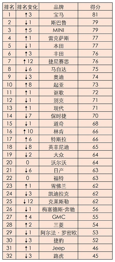 具体排名上看,宝马在CR年度汽车品牌中综合排名第一(得分81),为品牌首次;斯巴鲁从冠军降至第二(79);同属宝马集团的Mini第三(79)。雷克萨斯(77)、本田(77)、丰田(76)、捷尼赛思(76)、马自达(75)、奥迪(74)和起亚(73)分列4至10位。其中,捷尼赛思相比去年上升12位,进步最大;马自达则下降6位。