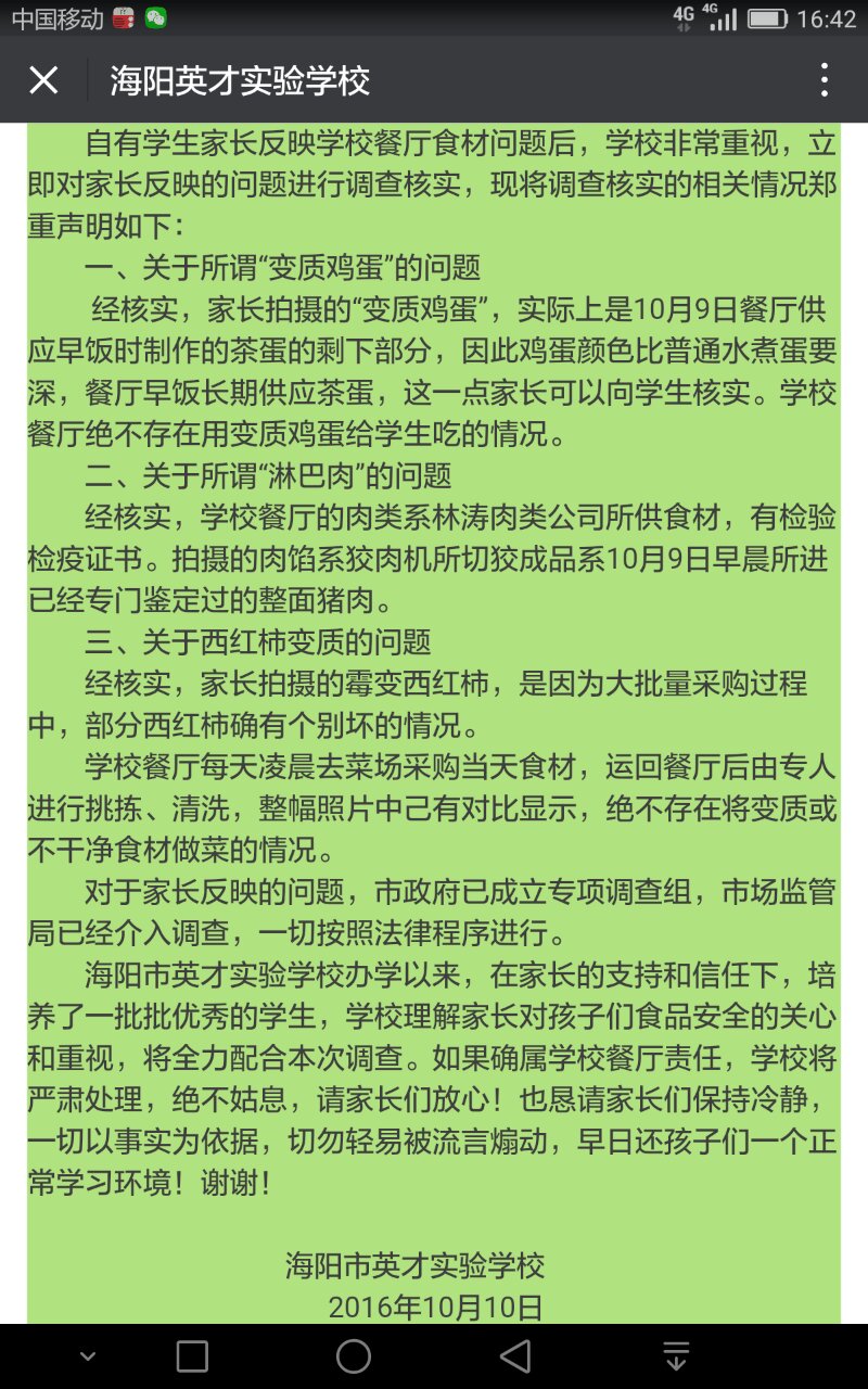 海阳市英才实验学校办学以来,在家长的支持和信任下,培养了一批批优秀的学生,学校理解家长对孩子们食品安全的关心和重视,将全力配合本次调查。如果确属学校餐厅责任,学校将严肃处理,绝不姑息,请家长们放心!也恳请家长们保持冷静,一切以事实为依据,切勿轻易被流言煽动,早日还孩子们一个正常学习环境!谢谢!
