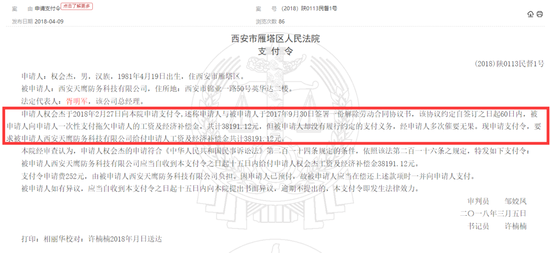 西安天鹰防务科技有限公司劳动纠纷记录;来源:中国裁判文书网