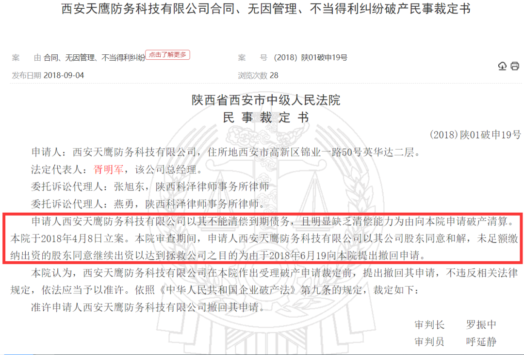 西安天鹰防务科技有限公司曾申请过破产的公开记录;来源:中国裁判文书网