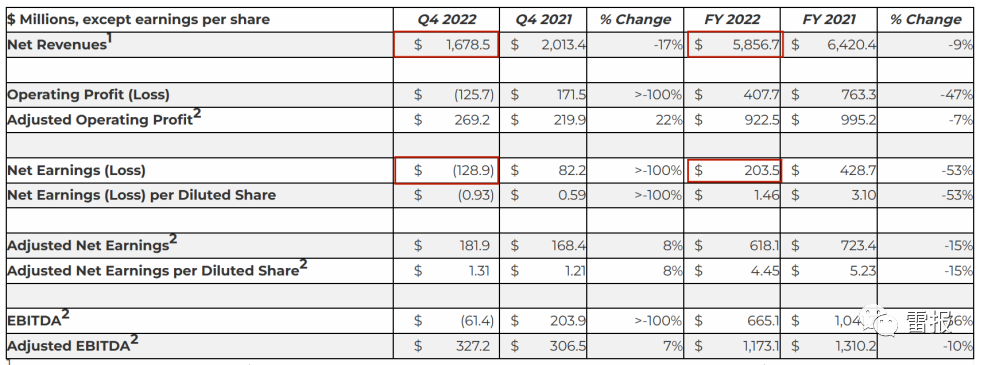 2022年Q4,孩之宝的净收入为16.79亿美元(约合人民币115.24亿元),同比下降17%,净亏损达到1.29亿美元(约合8.85亿元)。2022全年的净收入58.57亿美元(约合402亿元),同比下降9%,实现净利润2.04亿美元(约合14亿元),相比2021年下跌超53%。