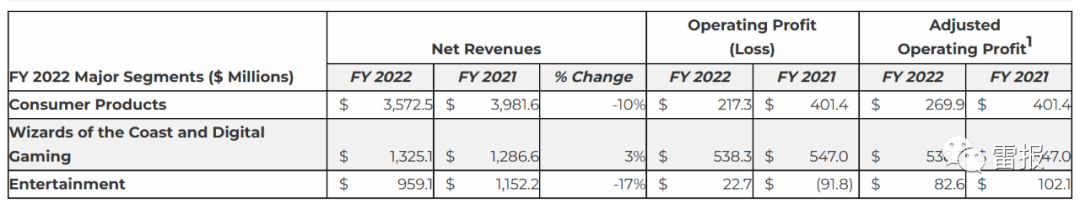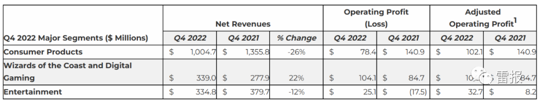 【娱乐】部门则包括孩之宝和子公司eOne推出的所有娱乐内容的收入,涵盖电影、电视以及家庭品牌等业务。该部门在2022年Q4实现净收入3.35亿美元,同比下降12%,全年则下降了17%。