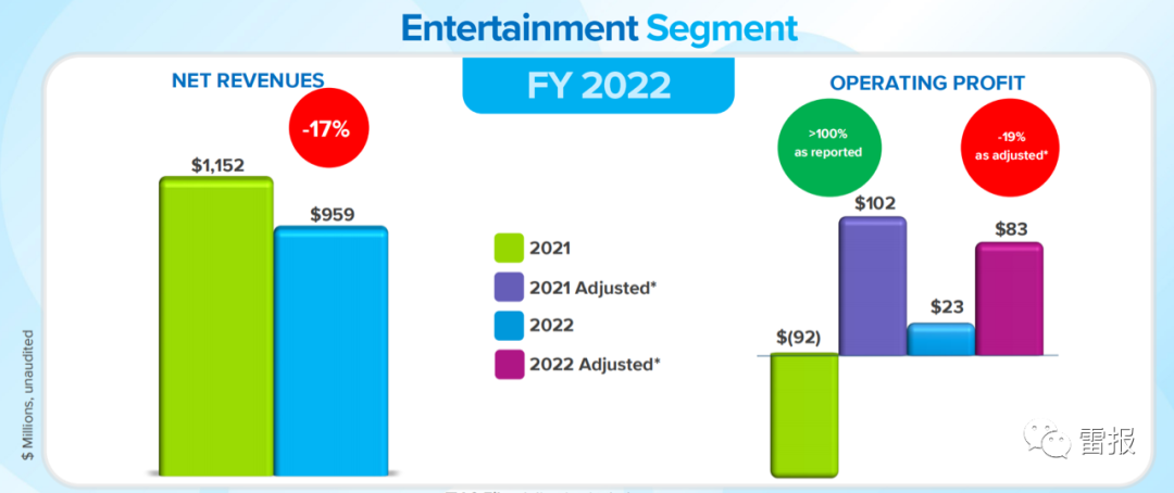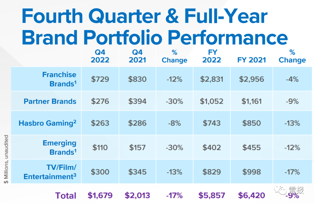 【电视/电影/娱乐】类别下的业绩在Q4和全年分别同比下降13%和17%,这受到2022年内电影内容交付减少以及2021年第三季度孩之宝出售音乐业务的影响。
